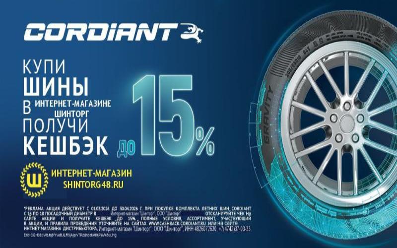 • 15% (пятнадцать процентов) на летние шины Cordiant с 17 по 18 дюйма с 01.03.2026 г. по 30.04.2026 г. включительно